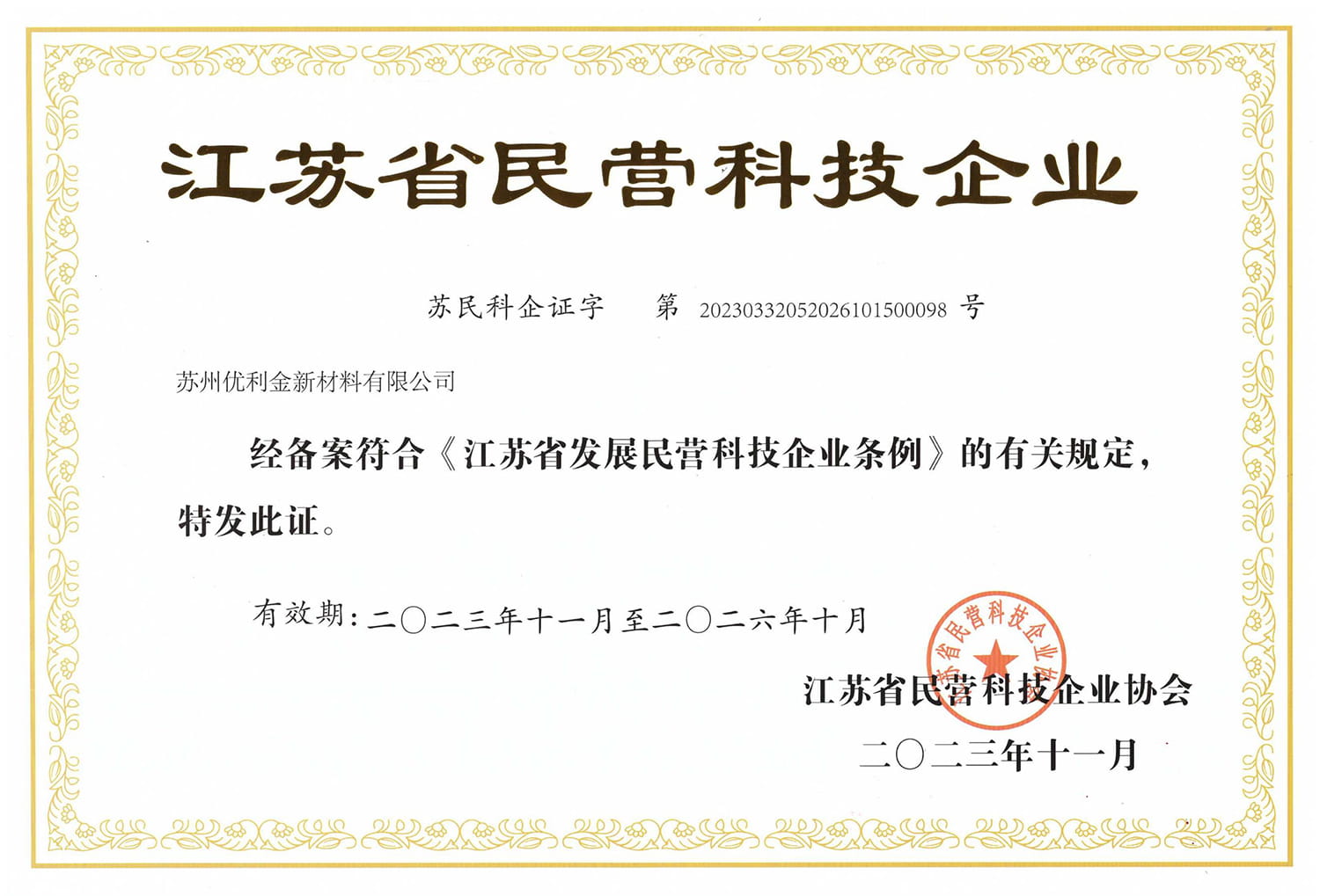 2023年11月,公司获评“江苏省民营科技企业”,获评苏州市“守合同重信用企业”。